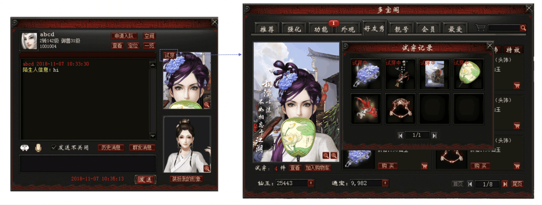 Solution 2: Add a one-tap "try on friend's outfit" button in the friend chat interface. Clicking it takes the player directly to the shop's try-on screen for that look, creating a seamless path from social interaction to purchase.